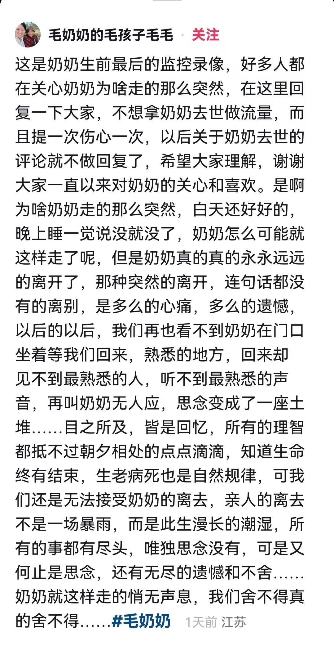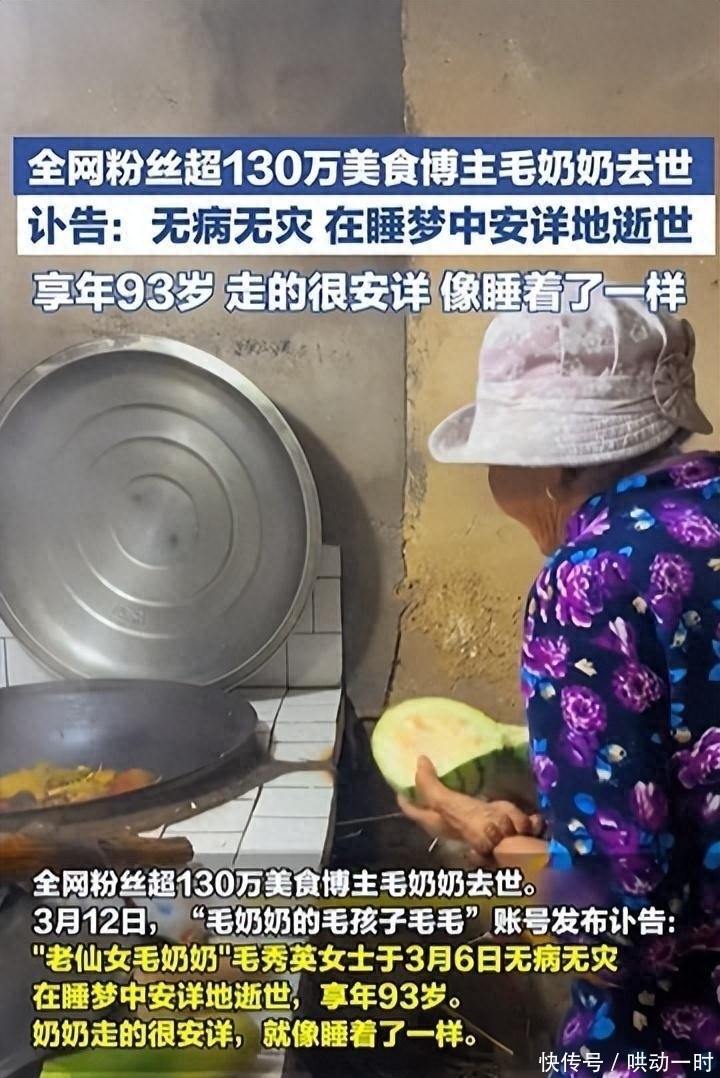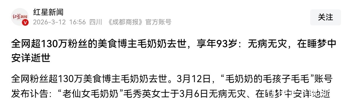 红星新闻——全网超130万粉丝的美食博主毛奶奶去世,享年93岁:无病无灾,在睡梦中安详逝世